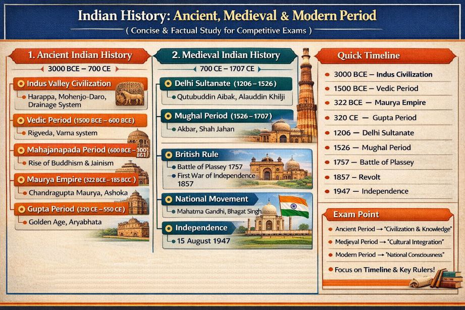 Hello Readers! आप यहाँ भारत के गौरवशाली इतिहास को विस्तार से जानेंगे (Indian History from Ancient to Modern)। प्राचीन सिंधु घाटी सभ्यता से लेकर मुगल साम्राज्य और भारतीय स्वतंत्रता संग्राम तक, यहाँ आपको हर युग की महत्वपूर्ण घटनाएँ और जानकारियाँ मिलेंगी। जो विभिन्न प्रतियोगी परीक्षाओं के लिए महत्वपूर्ण हैं।
